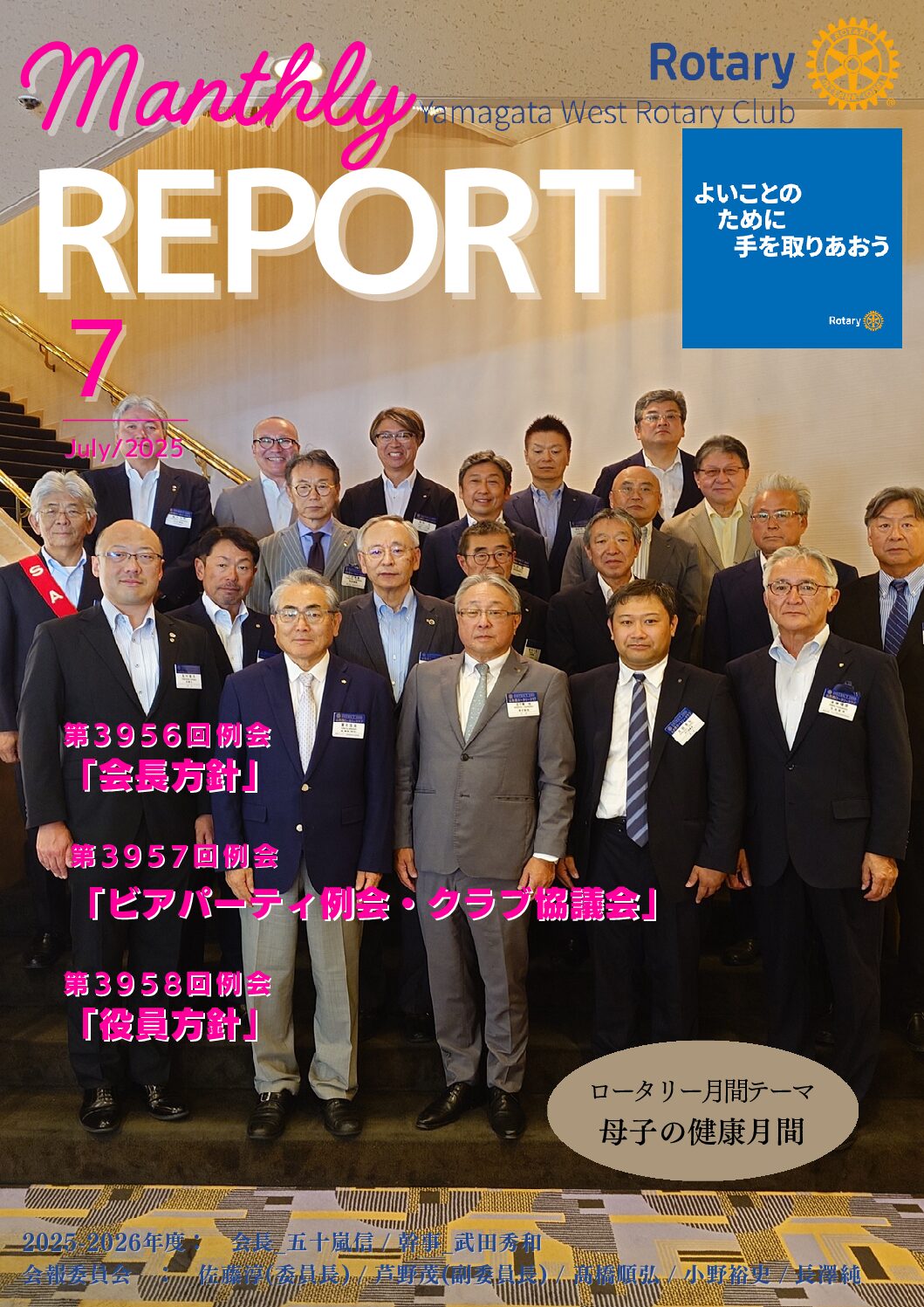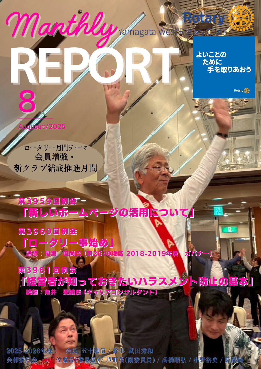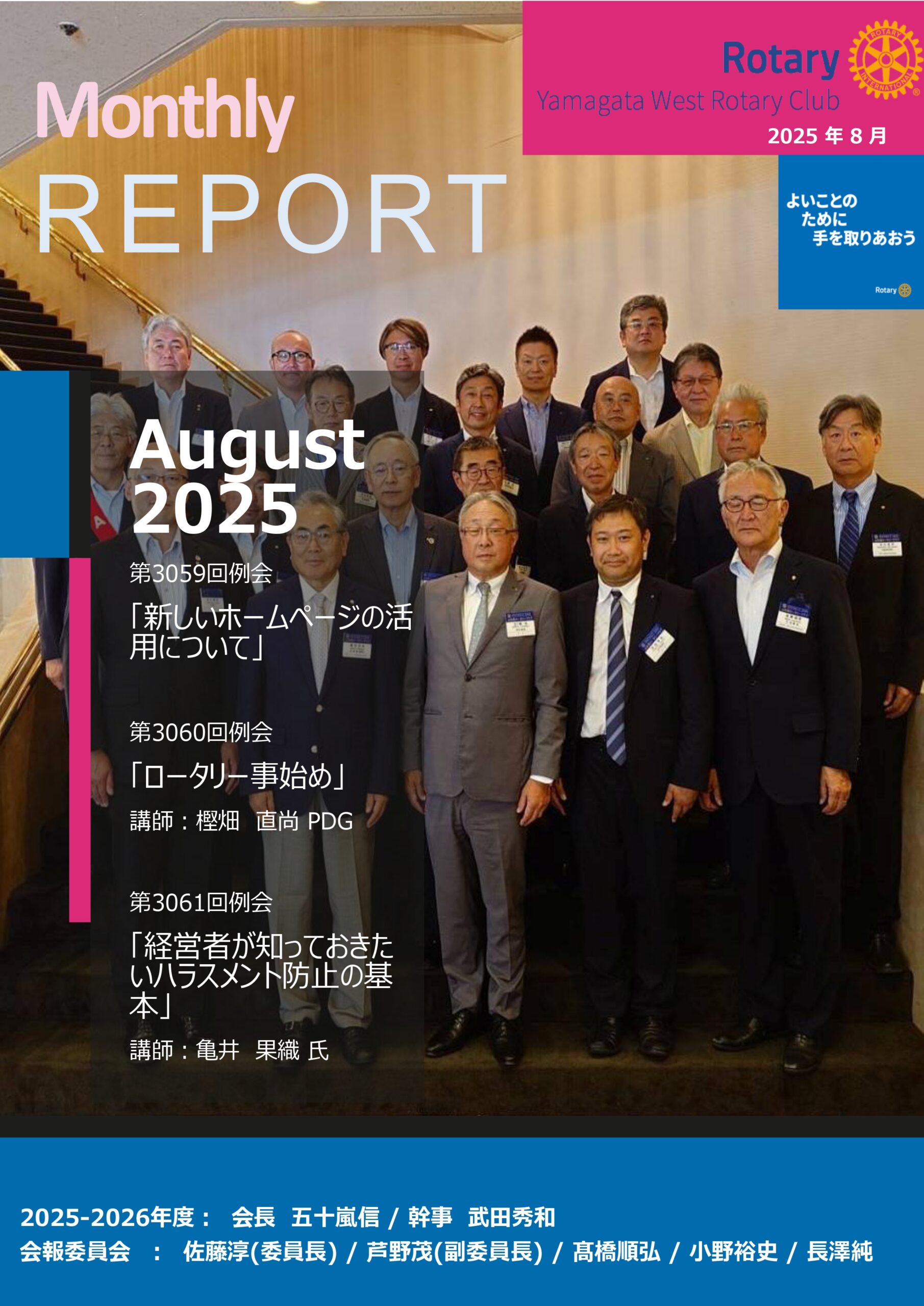 山形西ロータリークラブの活動をご紹介しています。PDFファイルでダウンロードができます。※順次更新して参ります。 2025・2026年度 2025年9月会報 第3063回 会長ごあいさつ第3062回 会長ごあいさつ 2025年9月会報データ 2025年8月会報 第3060回 会長ごあいさつ第3059回 会長ごあいさつ 2025年8月会報データ 2025年7月会報 第3058回 会長ごあいさつ第3057回 会長ごあいさつ第3056回 会長ごあいさつ 2025年7月会報データ PDFファイルが表示できない場合 PDFファイルで提供している文書等を表示するためには、表示するコンピュータ用の「リーダー」と呼ばれるプログラムが必要です。アドビシステム社は各機種用にPDFリーダーであるAdobe Reader(アドビリーダー)を無償配布しており、次の場所からダウンロードできます。 Get Acrobat Reader